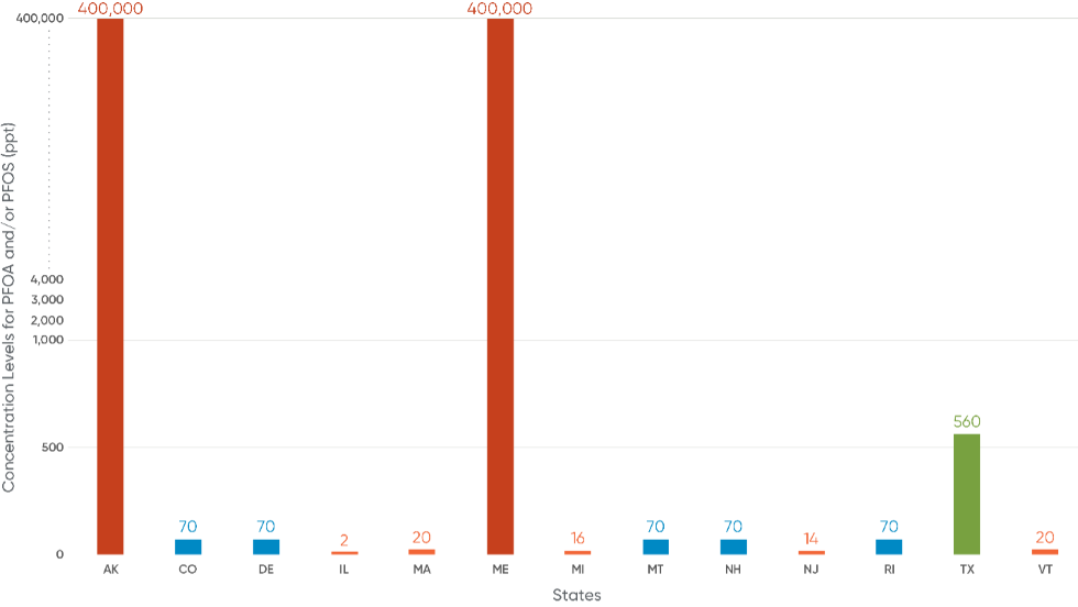 Without a federal PFAS standard, the various states have enacted a wide range of regulations, notifications, or advisories. For example, for PFAS substances in groundwater, the smallest concentration is 2 ppt (Illinois; PFOA only) and the largest value is 560,000 ppt (Illinois; PFHxA only). For consistency, the following chart illustrates the discrepancies in the concentration levels only for PFOA and/or PFOS.
